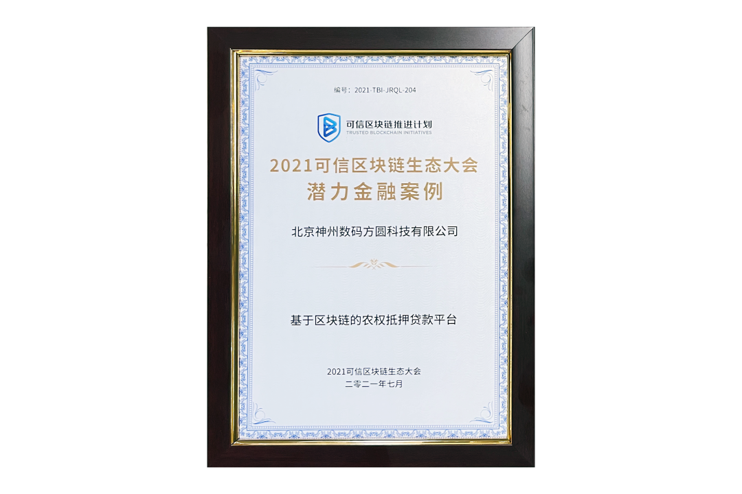7月13日,由中国信息通信研究院、可信区块链推进计划主办的“2021可信区块链生态大会”在京举办,并隆重发布系列成果。神州信息子公司北京350vip浦京集团方圆科技有限公司(简称:神州方圆)推荐的“基于区块链的农权抵押贷款平台”荣获十大金融应用高潜力案例,为“区块链+农业”落地带来示范效应。